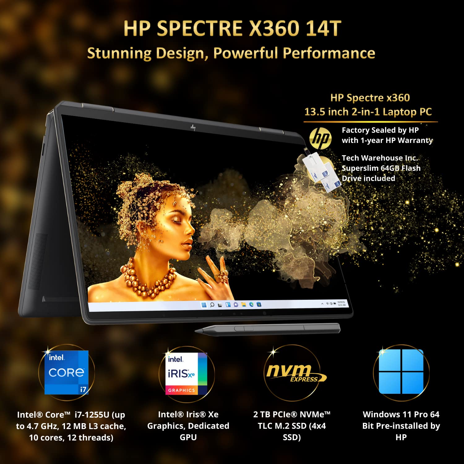 HP Spectre x360 14T Laptop i7-1255U, 16GB RAM, 2TB NVMe SSD, 13.5" WUXGA+ (1920x1280) 1000 nits Touchscreen, B&O, Wi-Fi 6E, Win 11 Pro,